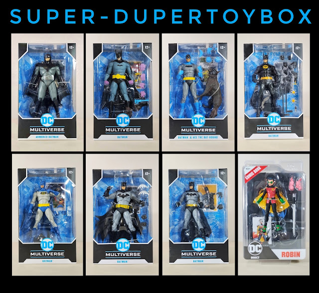 Below, all my new Batman figures with other McFarlane figures in my collection, Top Row: Batgirl, the first McFarlane Batman, and Night Wing, Dark Knight Returns Batman. Middle Row: Red Robin, and Future State Batman. Bottom Row: Hellbat and Flashpoint Batman.